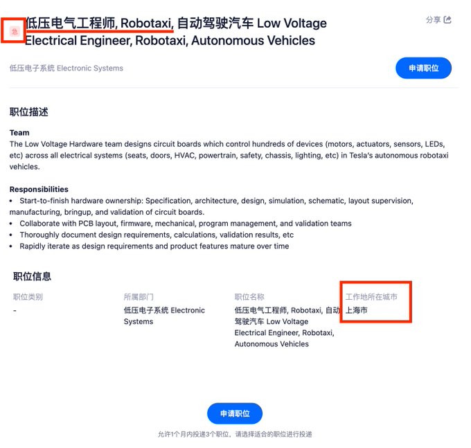 招聘信息显示,特斯拉中国目前正在招募一名低压电气工程师,负责公司自动驾驶车辆的电路板设计工作。