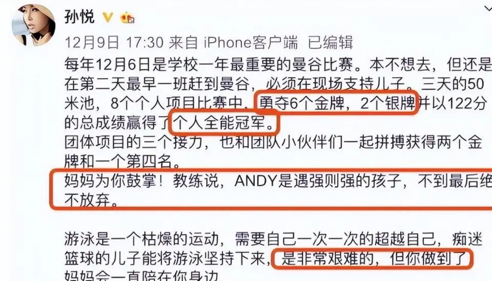 奇迹悄然发生。 游泳不仅控制了哮喘症状,还激发出儿子的运动天赋。 2019年,吴文祺在曼谷国际青少年运动会上一举夺得6金2银,成为瞩目的“冠军儿子”。 孙悦因此被粉丝称为“冠军妈妈”。